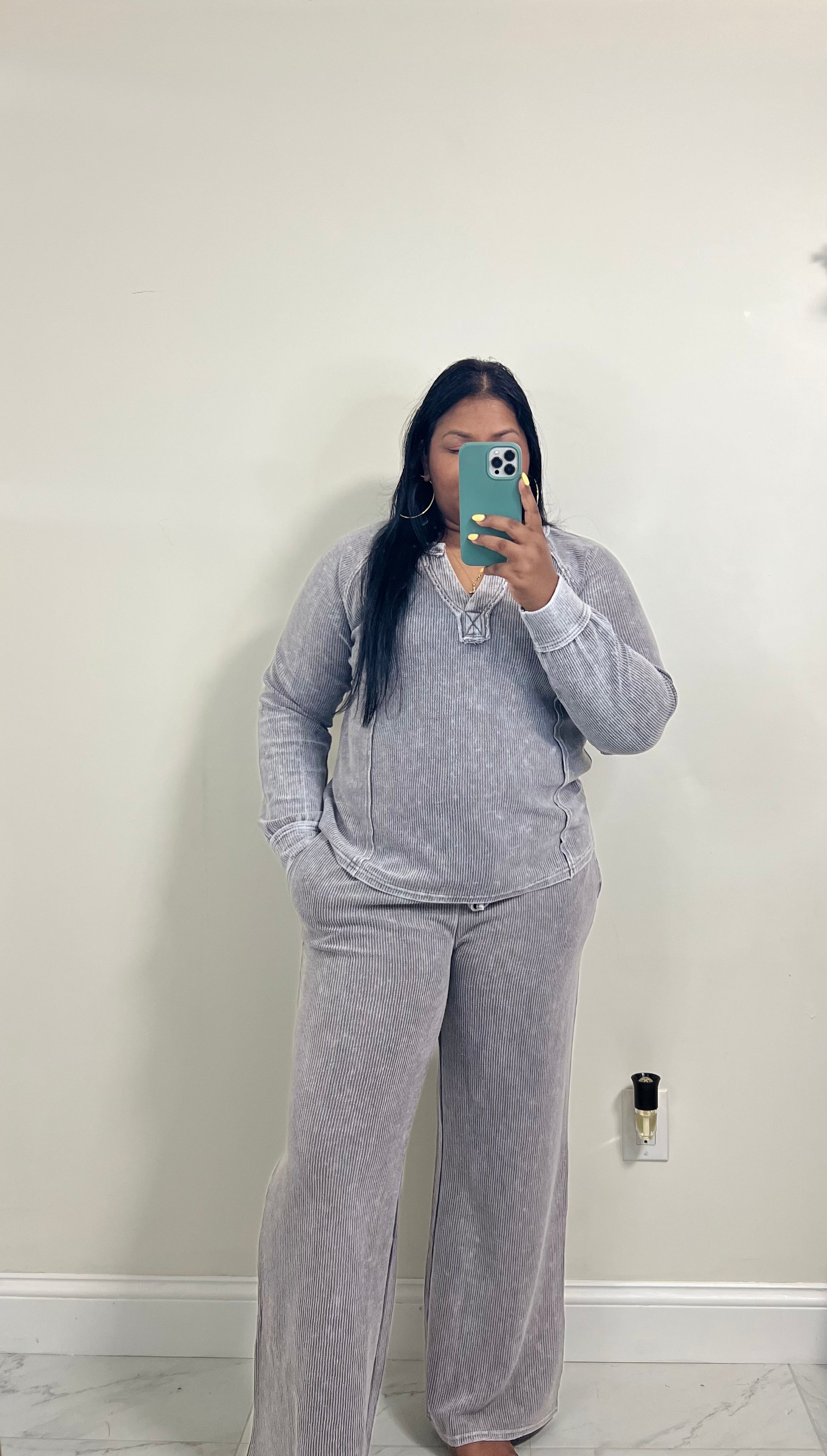 Washed Ribbed Split Neck Long Sleeve Pullover.