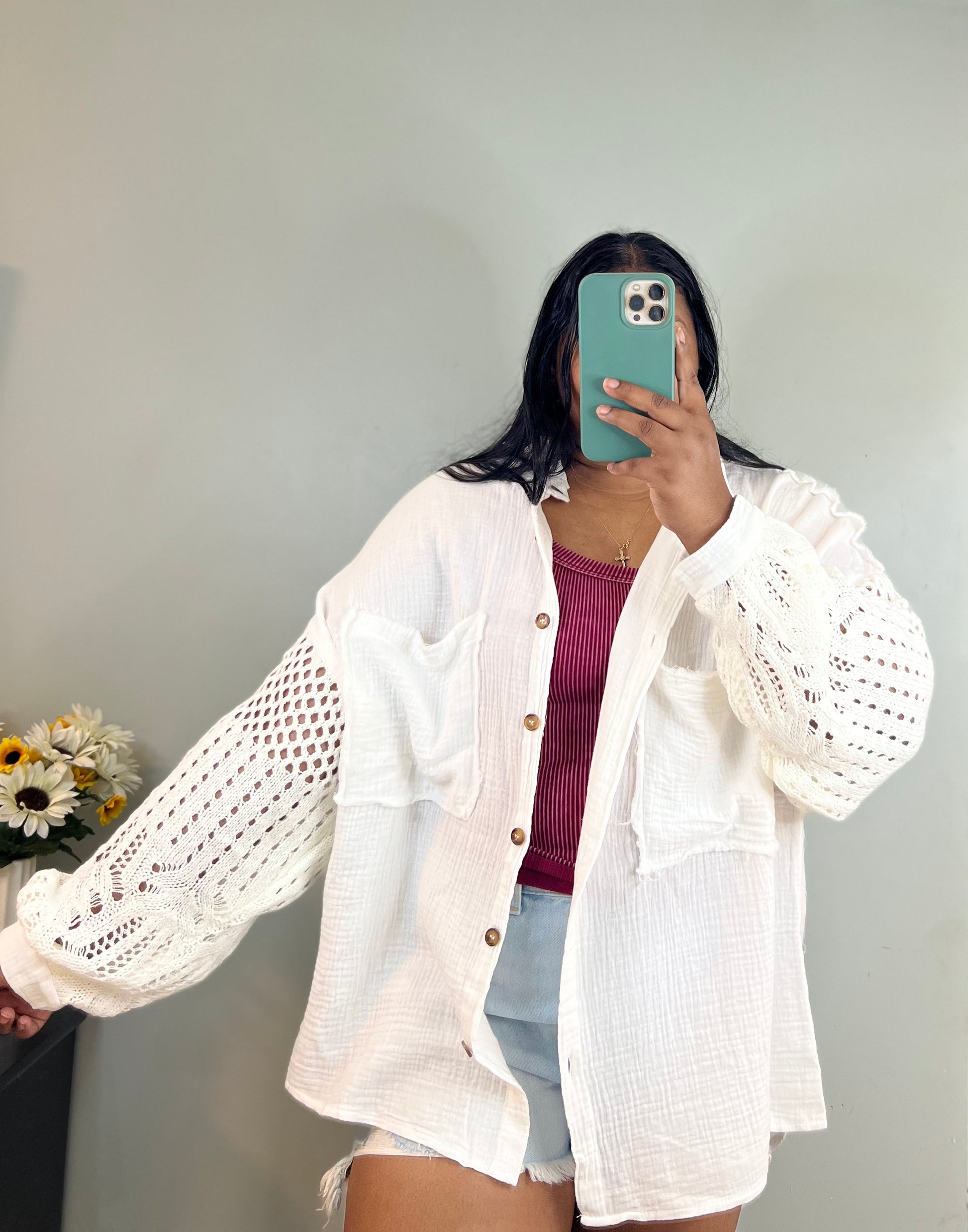 Oversized Shirt With SWeater Sleeve, Button Closure, Chest Pockets, Raw Edge Detailing Featured In Gauze Fabric.